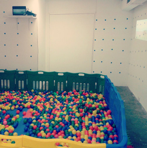 Ball pit installed in Runt Space on Open Day, with video work by